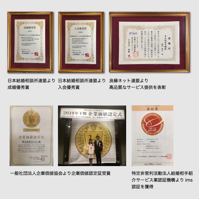 結婚相談業界には公的な機関や特定非営利活動法人などが存在しますが、インフィニでは多くの連盟・協会より表彰されています。※右記(一部)